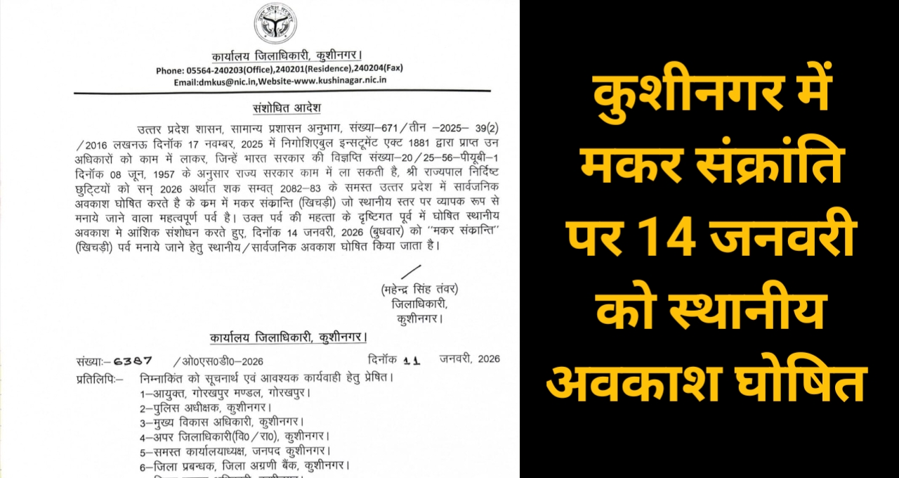 कुशीनगर जिला प्रशासन ने मकर संक्रांति (खिचड़ी) पर्व के अवसर पर 14 जनवरी 2026 (बुधवार) को स्थानीय/सार्वजनिक अवकाश घोषित किया है। यह निर्णय उत्तर प्रदेश शासन के निर्देशों के अनुपालन में लिया गया है, जिसमें पर्व की स्थानीय एवं सांस्कृतिक महत्वता को ध्यान में रखते हुए पूर्व घोषित अवकाश में आंशिक संशोधन किया गया है।